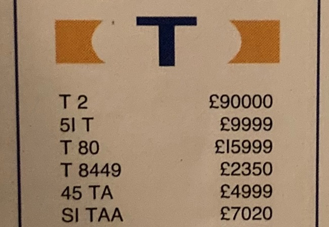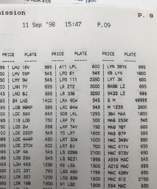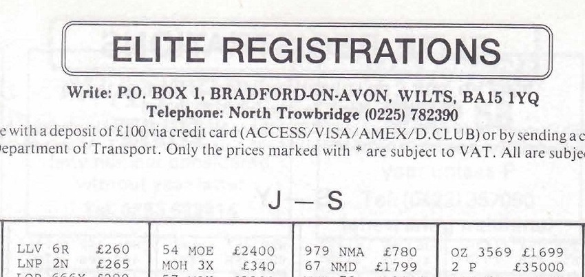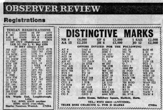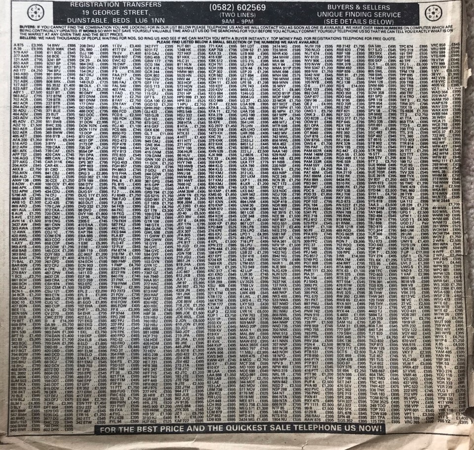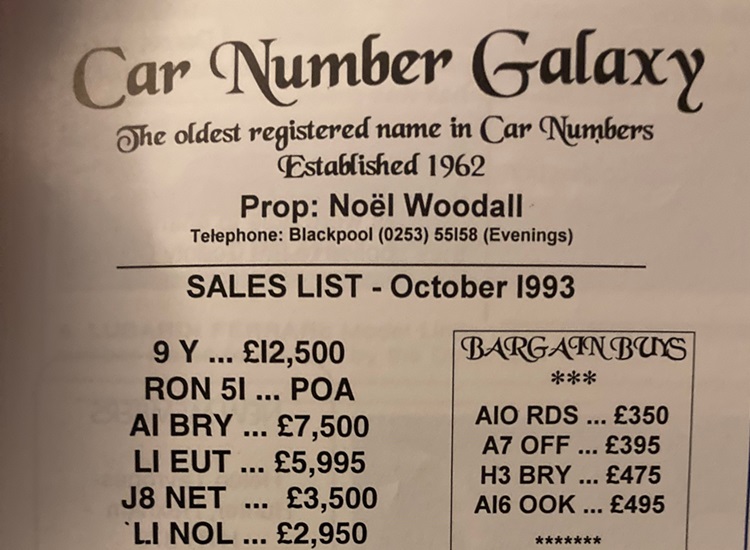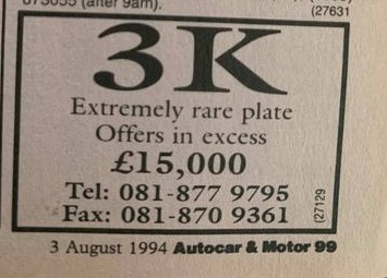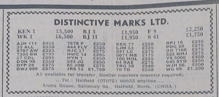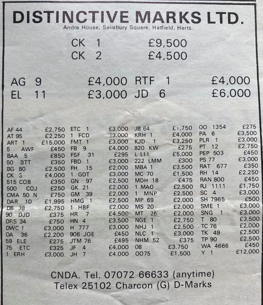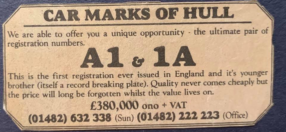 I've managed to date the advert to 1995/6 but when 1 A was sold at DVLA auction in December 1989 it sold for £202K, if a VAT registered company bought it then this dropped to £172K. So, a £172K plate is paired with its older sibling, a plate with the letter and number the right way round so certainly worth more, yet the asking price is just £380K + VAT (so 1 A represents at least 45% of this value). Strange. Someone did point out to me that the UK had a nasty recession in the very early 90's and this would certainly explain the pricing.