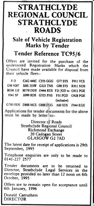 An advert from the Sunday Times in September 1995 inviting offers for V 0, it didn't sell for unknown reasons.