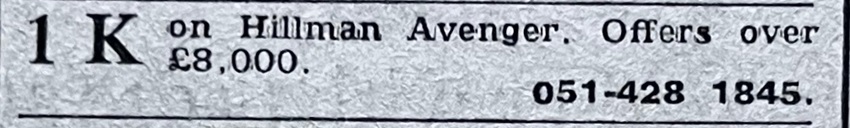 An ad from Motor magazine dated February 1975 offering 7 K for £1K. The price was dropped to £850 before it sold.