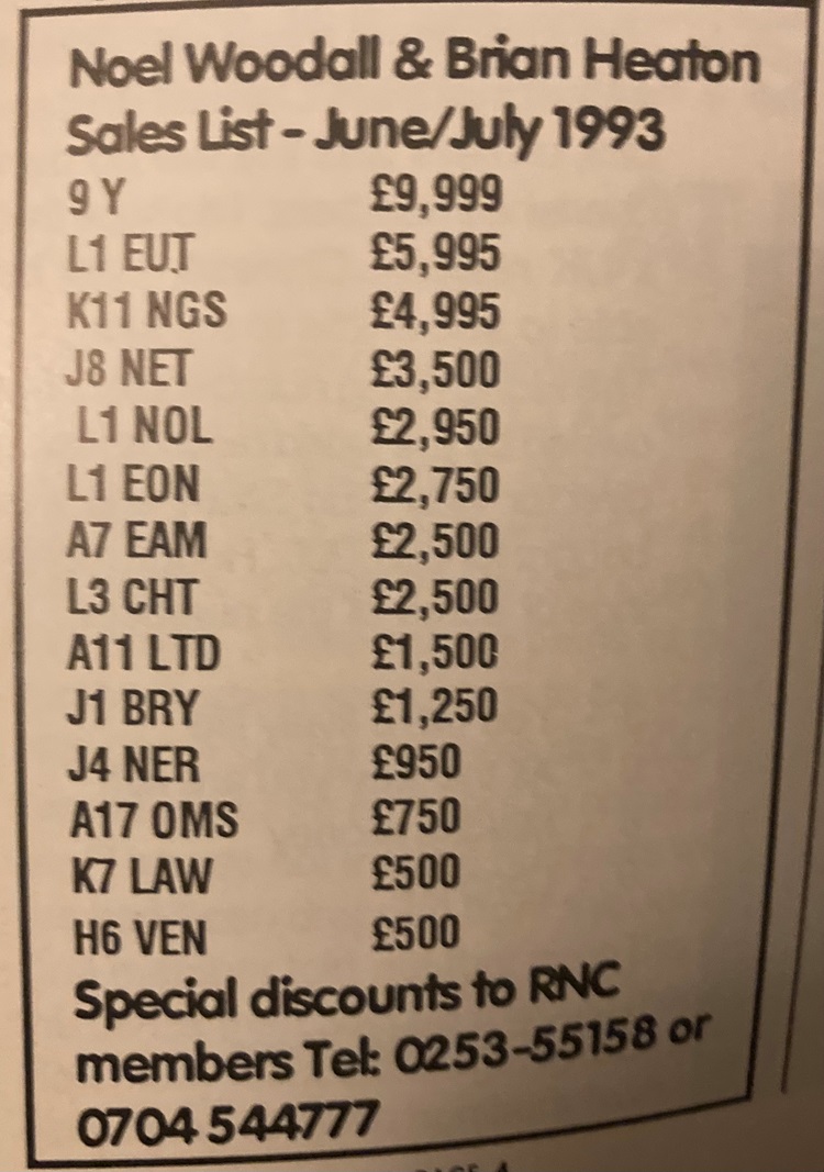 An ad the RNC newsletter from October 1993 offering 9 Y for £12.5K